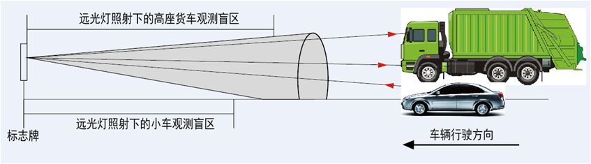 傳統交通標志是通過反光膜的逆反射(reflective)功能來實現交通語言信息被動反光,然而,反光膜的逆反射功能是存在一定的局限性,在《城市道路交通標志和標線設置規范》(GB51038)等 多部標準中,明確提出,“位于行車道上方標志版面的逆反射性能,宜比路側標志提高一個等級”、“通行大型車位為主的道路宜采用V類大廣角反光膜”,這是由于普通標志在遠光燈照射下,由于光的衍射性能,在反射時會形成光錐,并形成核心亮,外圍暗的特征,如下圖,這就是為什么大角度下標志反光不清;高座貨車的觀察視角下,看到的交通標志很大一部分是不反光的原因。而主動發光標志,由于光的漫反射現象,在不通的角度都能清晰視認標志信息。