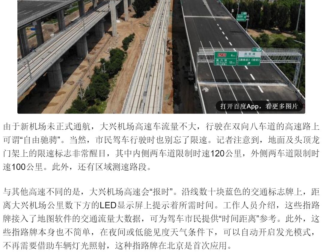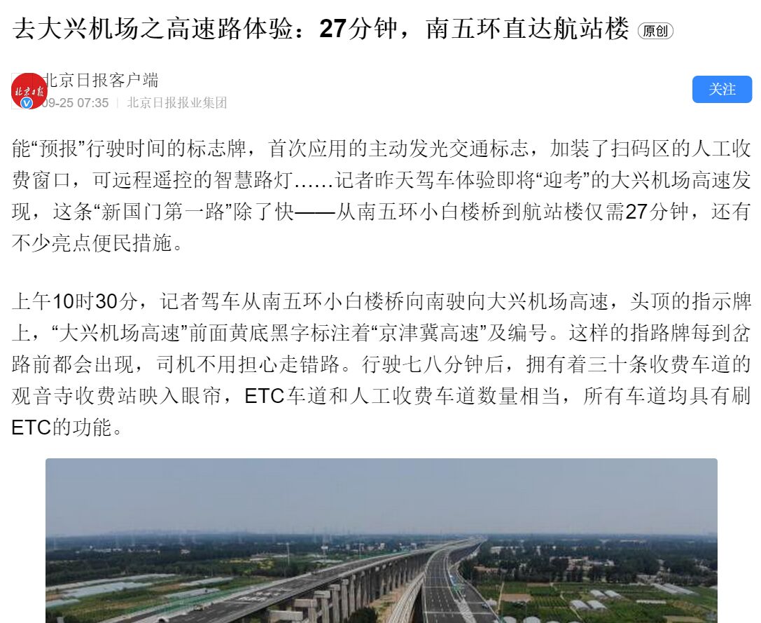 9月25日,《北京日報客戶端》在“去大興機場之高速路體驗:27分鐘,南五環直達航站樓”新聞報道中提到:“能“預報”行駛時間的標志牌,首次應用的主動發光交通標志,加裝了掃碼區的人工收費窗口,可遠程遙控的智慧路燈.......”,"與其它高速不同的是,大興機場高速會“報時”。沿線數十塊藍色的交通標志牌上,距離大興機場公里數下方的LED顯示屏上提示著所需時間。工作人員介紹,這些指路標志牌接入了地圖軟件的交通流量大數據,可為駕車市民提供“時間距離”參考。此外,這些指路牌本身也不簡單,在夜間或低能見度天氣條件下,可以自動開啟發光模式,不再需要借助車輛燈光照射,這種指路牌在北京是首次應用"。