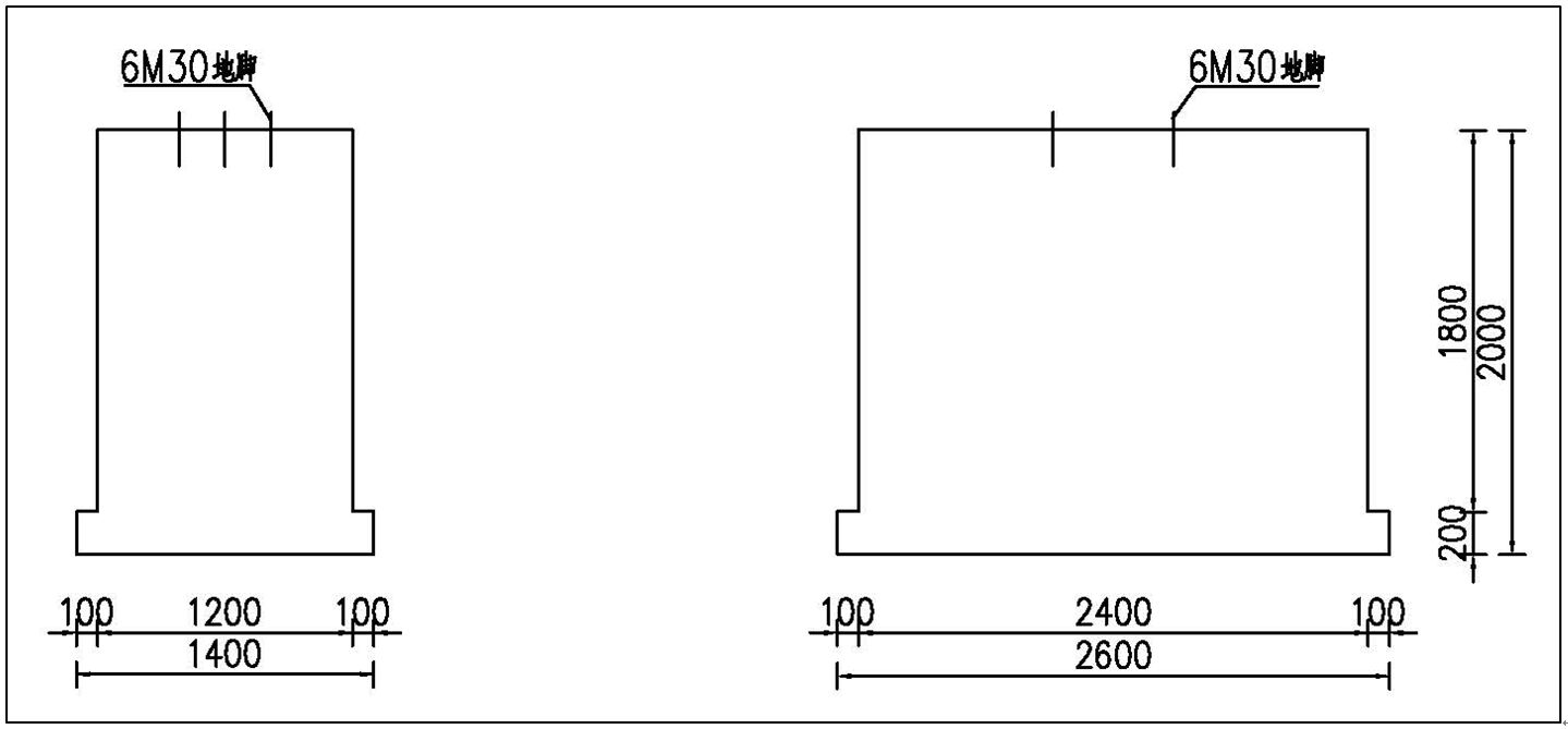 上層基礎寬 WF = 1.20(m), 高 HF = 1.80(m), 長 LF = 2.20(m),下層基礎寬 WF = 1.20(m), 高 HF = 0.20(m), 長 LF = 2.60(m)