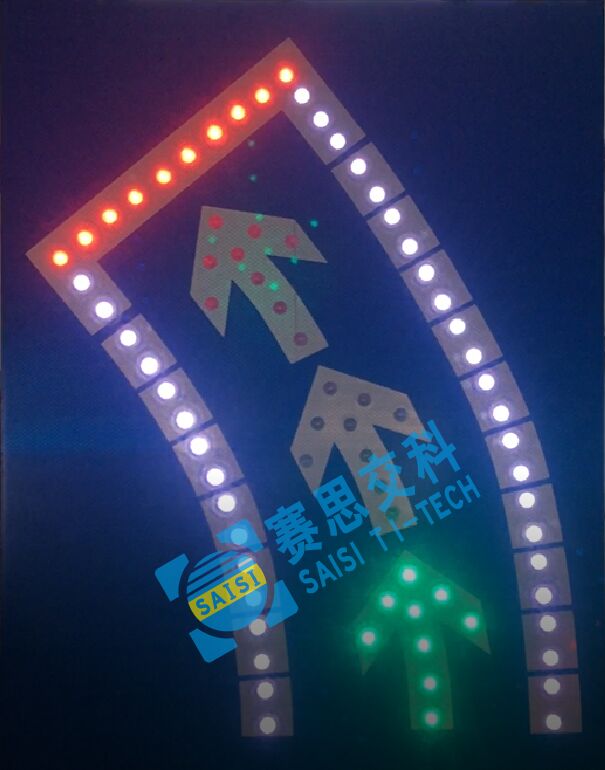 2、工藝說明:標(biāo)志版面由LED發(fā)光管組成停車線、邊緣線、箭頭圖形,通過控制模塊調(diào)取信號燈燈色狀態(tài),在標(biāo)志版面形成動態(tài)三種狀態(tài),動態(tài)引導(dǎo)待轉(zhuǎn)車流通行權(quán)限。