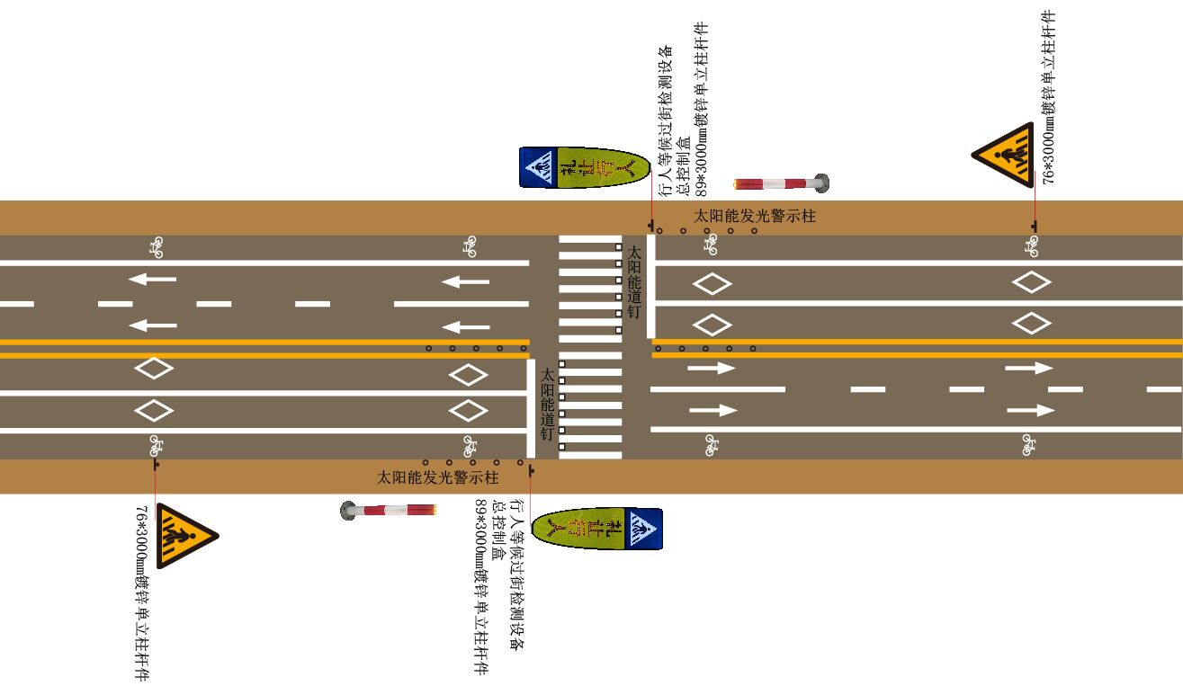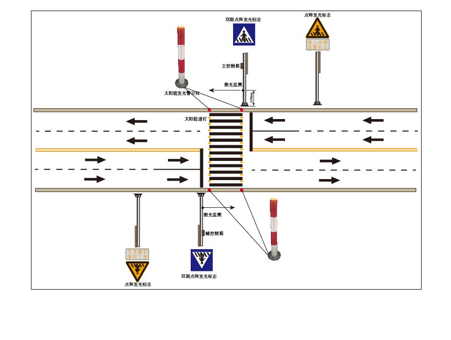本解決方案所涉安全設(shè)施包括:主動發(fā)光注意行人標志、太陽能發(fā)光警示柱、太陽能道釘、主動發(fā)光“禮讓行人”標志、行人過街檢測感應設(shè)備、數(shù)據(jù)傳輸接受設(shè)備等。