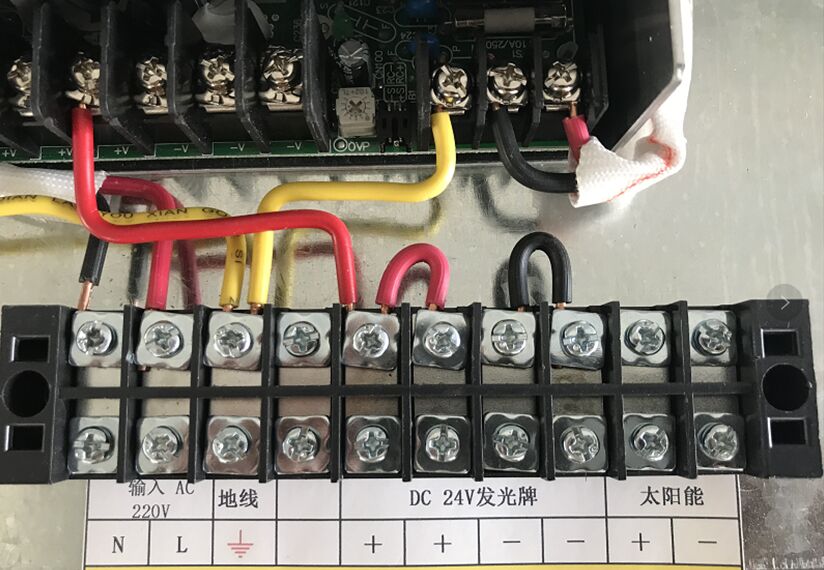 3、半透發光標志上的電線接入控制箱內的低壓DC-24V輸出端子,本次標志正極為棕色線;負極為藍色線。外接電源線接入高壓輸入端子。地線必須接地,導入地面土壤內。
