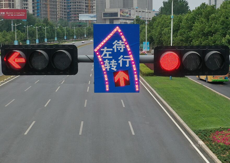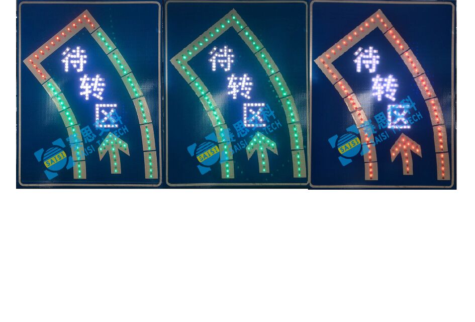 ?2、工藝說明:標志版面由LED發光管組成停車線、邊緣線、“左轉待行”文字;由顯示屏動態(P10)顯示紅、黃、綠三色動態箭頭,通過控制模塊調取信號燈燈色狀態,在標志版面形成動態三種狀態,動態引導待轉車流通行權限。