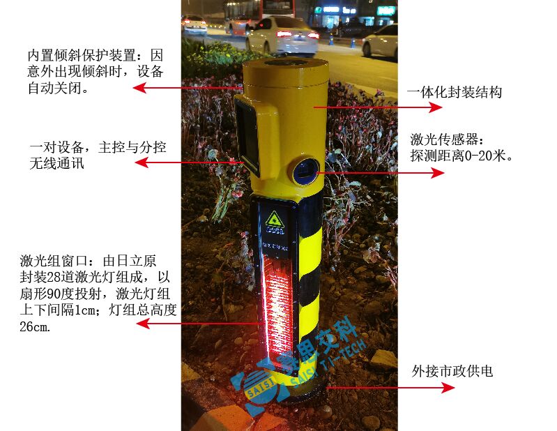當(dāng)行人即將進(jìn)入斑馬線將要過街的瞬間,本裝置快速、準(zhǔn)確檢測到有行人過街,立刻投射28條紅色激光線到過街行人小腿處,形成明顯的紅色區(qū)域投影警示,機(jī)動車駕駛員可以在照明不足、注意力不集中或視線受影響情況下(對面車輛遠(yuǎn)光、雨霧天氣等),遠(yuǎn)距離得到紅色警示和發(fā)現(xiàn)行人動態(tài),并及時做出反應(yīng),從而減少交通意外的發(fā)生。