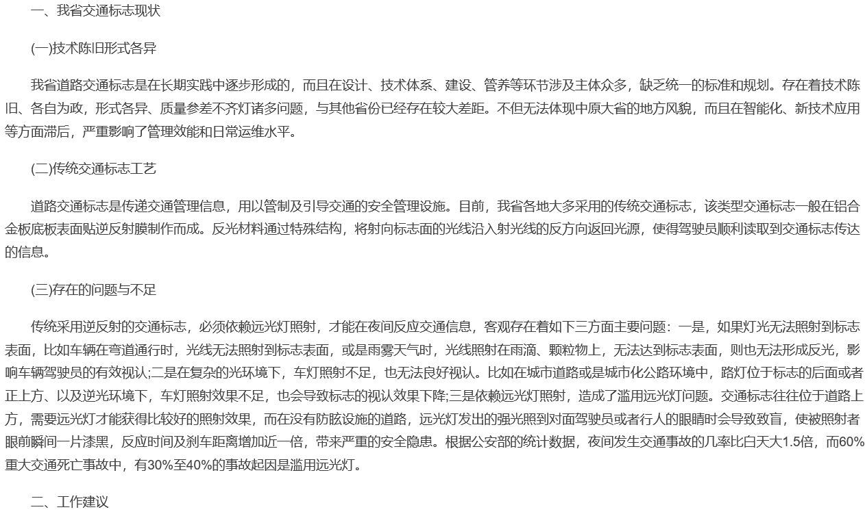 傳統(tǒng)的逆反射交通標(biāo)志,在特殊的交通環(huán)境種,存在功能的局限性。《人民交通網(wǎng)》于2022年1月12日發(fā)文《關(guān)于編制統(tǒng)一的交通標(biāo)志設(shè)置規(guī)范 推廣應(yīng)用主動(dòng)發(fā)光交通標(biāo)志》中提到:“傳統(tǒng)采用逆反射的交通標(biāo)志,必須依賴(lài)遠(yuǎn)光燈照射,才能在夜間反應(yīng)交通信息,客觀存在著如下三方面主要問(wèn)題:一是,如果燈光無(wú)法照射到標(biāo)志表面,比如車(chē)輛在彎道通行時(shí),光線無(wú)法照射到標(biāo)志表面,或是雨霧天氣時(shí),光線照射在雨滴、顆粒物上,無(wú)法達(dá)到標(biāo)志表面,則也無(wú)法形成反光,影響車(chē)輛駕駛員的有效視認(rèn);二是在復(fù)雜的光環(huán)境下,車(chē)燈照射不足,也無(wú)法良好視認(rèn)。比如在城市道路或是城市化公路環(huán)境中,路燈位于標(biāo)志的后面或者正上方、以及逆光環(huán)境下,車(chē)燈照射效果不足,也會(huì)導(dǎo)致標(biāo)志的視認(rèn)效果下降;三是依賴(lài)遠(yuǎn)光燈照射,造成了濫用遠(yuǎn)光燈問(wèn)題。交通標(biāo)志往往位于道路上方,需要遠(yuǎn)光燈才能獲得比較好的照射效果,而在沒(méi)有防眩設(shè)施的道路,遠(yuǎn)光燈發(fā)出的強(qiáng)光照到對(duì)面駕駛員或者行人的眼睛時(shí)會(huì)導(dǎo)致致盲,使被照射者眼前瞬間一片漆黑,反應(yīng)時(shí)間及剎車(chē)距離增加近一倍,帶來(lái)嚴(yán)重的安全隱患。根據(jù)公安部的統(tǒng)計(jì)數(shù)據(jù),夜間發(fā)生交通事故的幾率比白天大1.5倍,而60%重大交通死亡事故中,有30%至40%的事故起因是濫用遠(yuǎn)光燈。”。