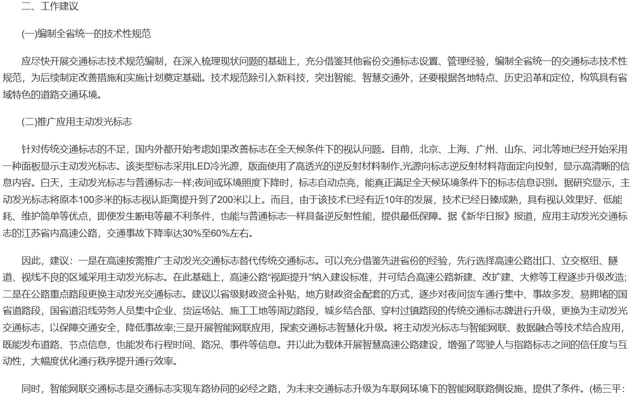 主動(dòng)發(fā)光標(biāo)志,因其具備獨(dú)特的功能優(yōu)勢(shì),主要有:(1)能主動(dòng)發(fā)光,不需依賴(lài)汽車(chē)遠(yuǎn)光燈照射;(2)提升標(biāo)志的遠(yuǎn)距離視認(rèn)性;(3)增強(qiáng)標(biāo)志的易捕捉性和警示性;(4)增強(qiáng)標(biāo)志在雨、霧、冰、雪、霾、逆光等惡劣交通環(huán)境中,仍能保持良好的顯示效果。上述功能能彌補(bǔ)在特殊交通環(huán)境中普通逆反射標(biāo)志的功能不足現(xiàn)象。為此,文中還給出相關(guān)建議:“一是在高速按需推廣主動(dòng)發(fā)光交通標(biāo)志替代傳統(tǒng)交通標(biāo)志。可以充分借鑒先進(jìn)省份的經(jīng)驗(yàn),先行選擇高速公路出口、立交樞紐、隧道、視線不良的區(qū)域采用主動(dòng)發(fā)光標(biāo)志。在此基礎(chǔ)上,高速公路“視距提升”納入建設(shè)標(biāo)準(zhǔn),并可結(jié)合高速公路新建、改擴(kuò)建、大修等工程逐步升級(jí)改造;二是在公路重點(diǎn)路段更換主動(dòng)發(fā)光交通標(biāo)志。建議以省級(jí)財(cái)政資金補(bǔ)貼,地方財(cái)政資金配套的方式,逐步對(duì)夜間貨車(chē)通行集中、事故多發(fā)、易擁堵的國(guó)省道路段,國(guó)省道沿線勞務(wù)人員集中企業(yè)、貨運(yùn)場(chǎng)站、施工工地等周邊路段,城鄉(xiāng)結(jié)合部、穿村過(guò)鎮(zhèn)路段的傳統(tǒng)交通標(biāo)志牌進(jìn)行升級(jí),更換為主動(dòng)發(fā)光交通標(biāo)志,以保障交通安全,降低事故率;三是開(kāi)展智能網(wǎng)聯(lián)應(yīng)用,探索交通標(biāo)志智慧化升級(jí)。將主動(dòng)發(fā)光標(biāo)志與智能網(wǎng)聯(lián)、數(shù)據(jù)融合等技術(shù)結(jié)合應(yīng)用,既能發(fā)布道路、節(jié)點(diǎn)信息,也能發(fā)布行程時(shí)間、路況、事件等信息。并以此為載體開(kāi)展智慧高速公路建設(shè),增強(qiáng)了駕駛?cè)伺c指路標(biāo)志之間的信任度與互動(dòng)性,大幅度優(yōu)化通行秩序提升通行效率。”