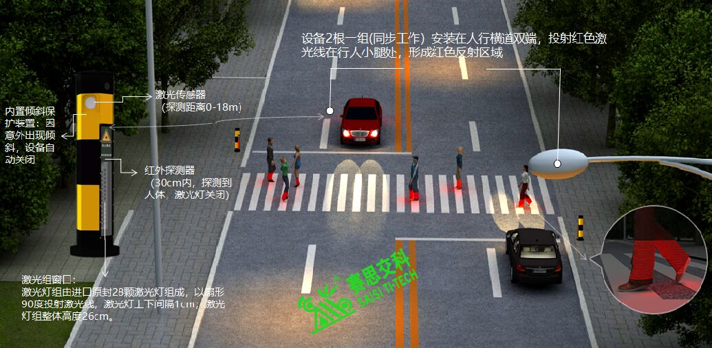 ?????? 為服務道路交通事故預防"減量控大"核心工作,為一線公安交管部門提供科技支撐和實用方案,南京賽思交通信息科技有限公司推出了人行橫道激光智能樁,旨在解決城市支干線道路、車道較多或中間有安全島的道路、城市郊區道路、國省道與沿線支小路交叉口中人行斑馬線的夜晚交通安全問題。全新的智能解決方案平衡了道路機動車的通行效率和斑馬線下的行人安全,將助力解決城市道路安全隱患“痛點”,填補市場空缺。目前方案已獲得國家發明專利,通過公安部交通安全產品檢測中心檢測認證,是市場上唯一具備知識產權和權威部門認證的相關產品和方案。