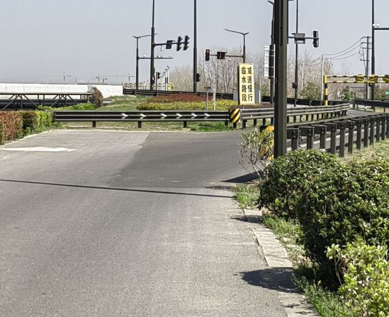 如下圖:前方道路突然向右改道,與前方主線道路交叉接入,僅靠正前方的護欄上黏貼6個反光膜向右箭頭(反光膜已基本散失反光效果),我們走近可以發現,護欄端頭上“傷痕累累”,可見不知有多少次的碰撞事故曾發生過。下圖左:前方突然向右改道;下圖右:護欄端頭傷痕累累。