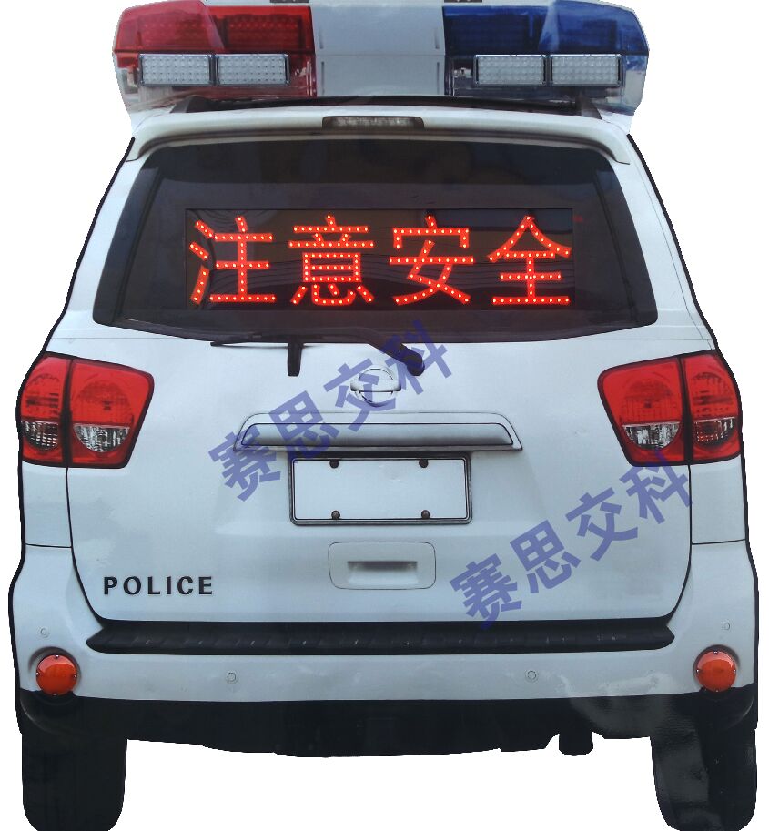 2、基本說(shuō)明:標(biāo)志面層為仿真等比例警車車尾UV噴繪圖案,面層采用鋁質(zhì)板材,標(biāo)志圖案、字樣輪廓嵌入紅色高倍LED發(fā)光管,上置紅、藍(lán)暴閃燈,下方左右各置全紅剎車燈,中間“車窗”設(shè)置發(fā)光警示標(biāo)語(yǔ),整體結(jié)構(gòu)合理,用材精致。
