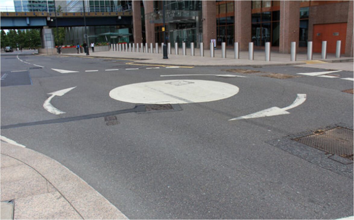 對(duì)角分流島是設(shè)置在交叉口對(duì)角線上的障礙物,以阻斷直行車流。其優(yōu)點(diǎn)是:不需要封閉街道,只需要改變現(xiàn)有街道的方向;能保證行人和自行車通行。缺點(diǎn)是:需要重新改造拐彎處的路緣,造價(jià)可能比較高;內(nèi)部和救援車有時(shí)需要繞行。